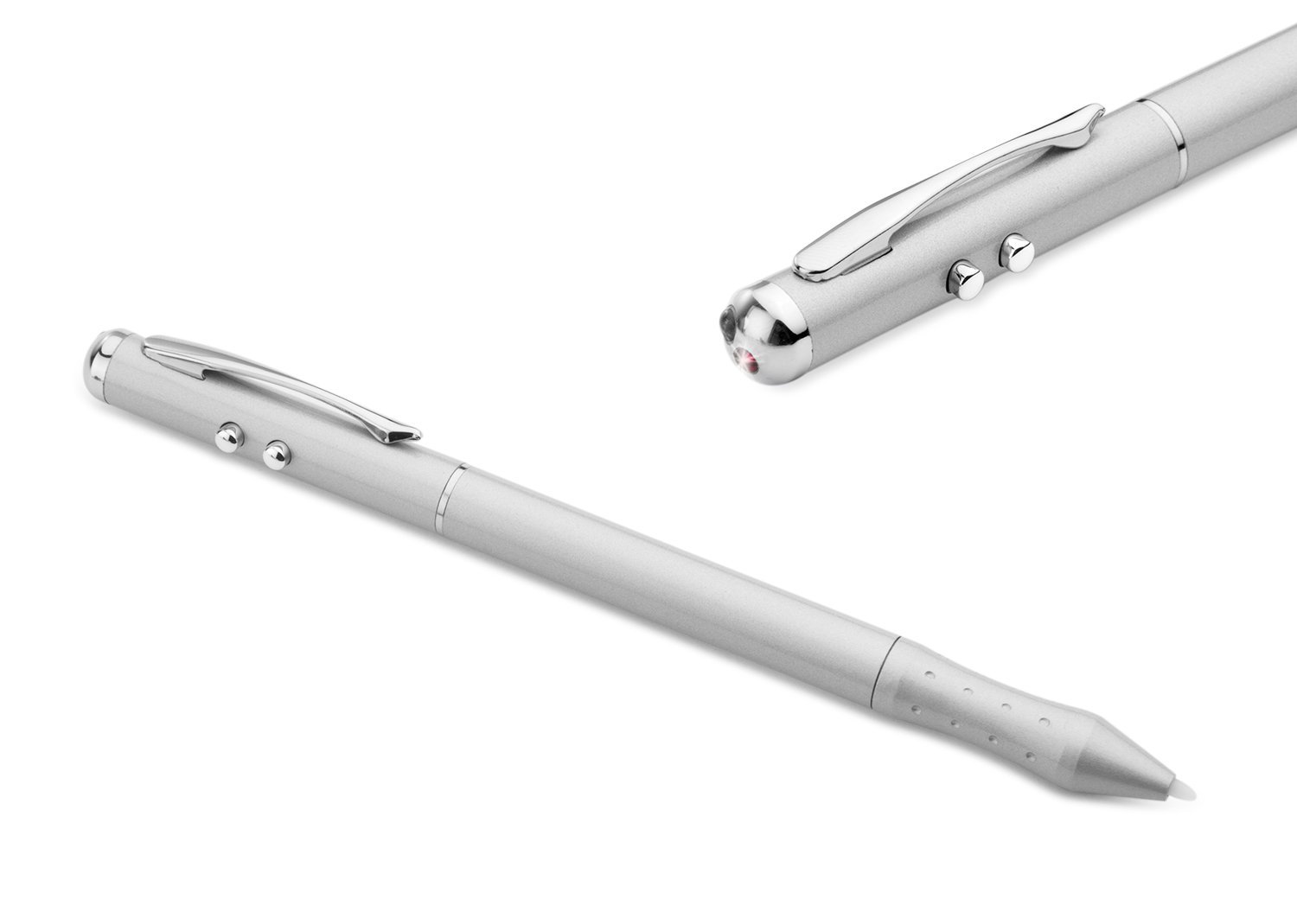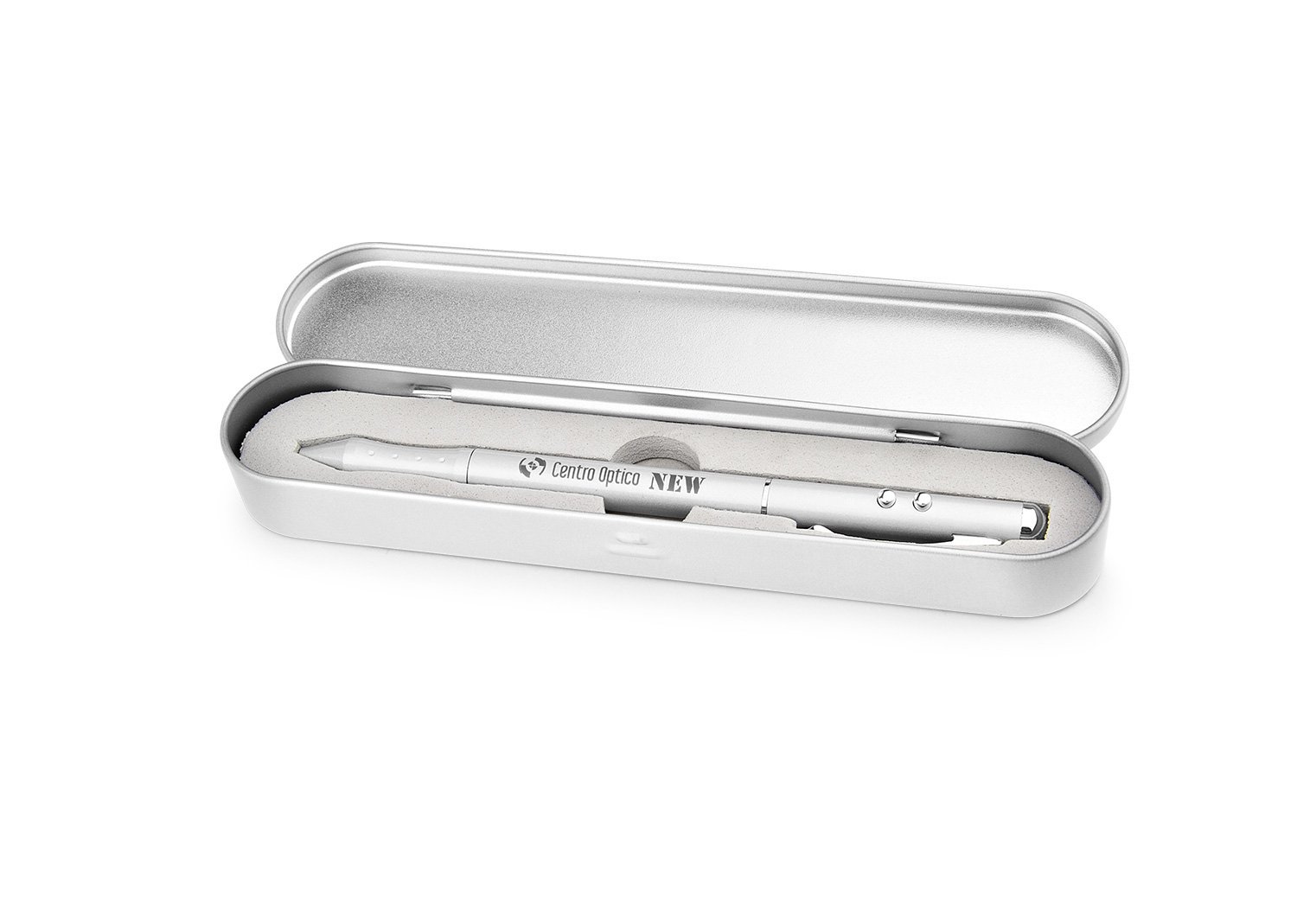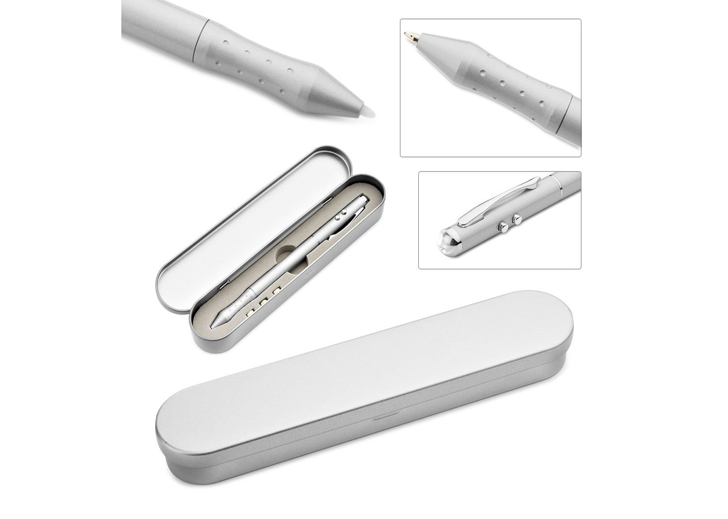 Bolígrafo con Linterna y láser, sistema de apertura Twist, incluye estuche metálico Individual y 3 pilas de repuesto. Útil como herramienta práctica para presentaciones, enseñanza, reuniones, discursos y capacitaciones. Puntero para pantallas Resistivas que normalmente son de uso profesional y de precisión. Como dispositivos bancarios por ejemplo.