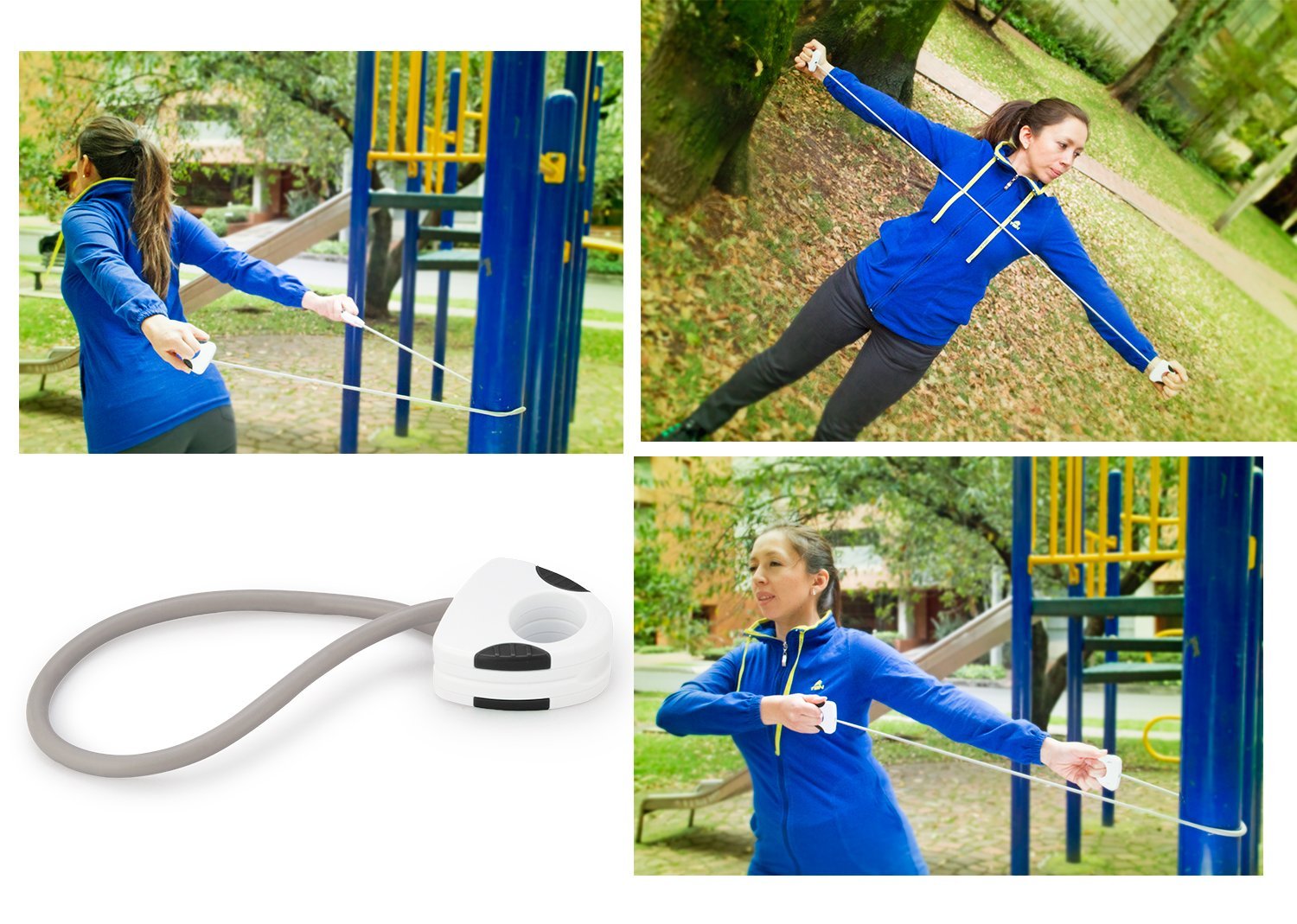 Banda elástica ideal para hacer entrenamiento fitness o de resistencia, con manijas para mejor agarre y sistema de apertura twist para separarlas, largo de la banda extendida 48 cm.