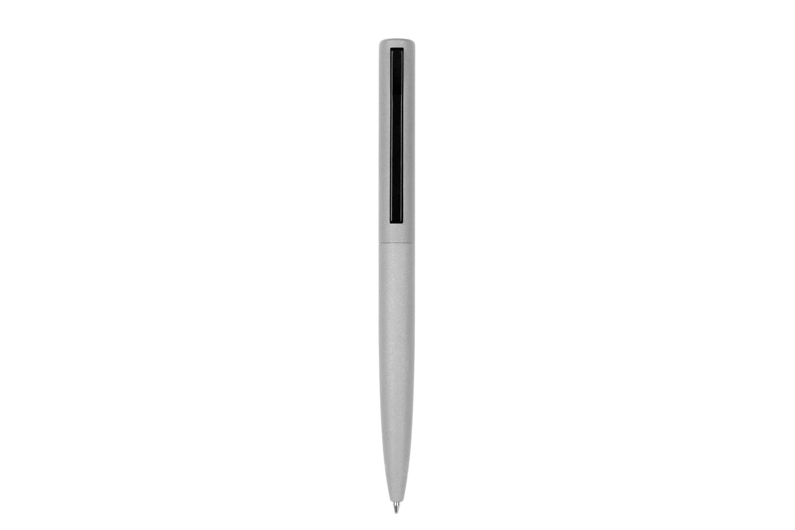 Metal. Cuerpo en metal, parte superior plástica con detalle de color negro. El clip funciona como pulsador. Ideal para imprimir en tampografia.