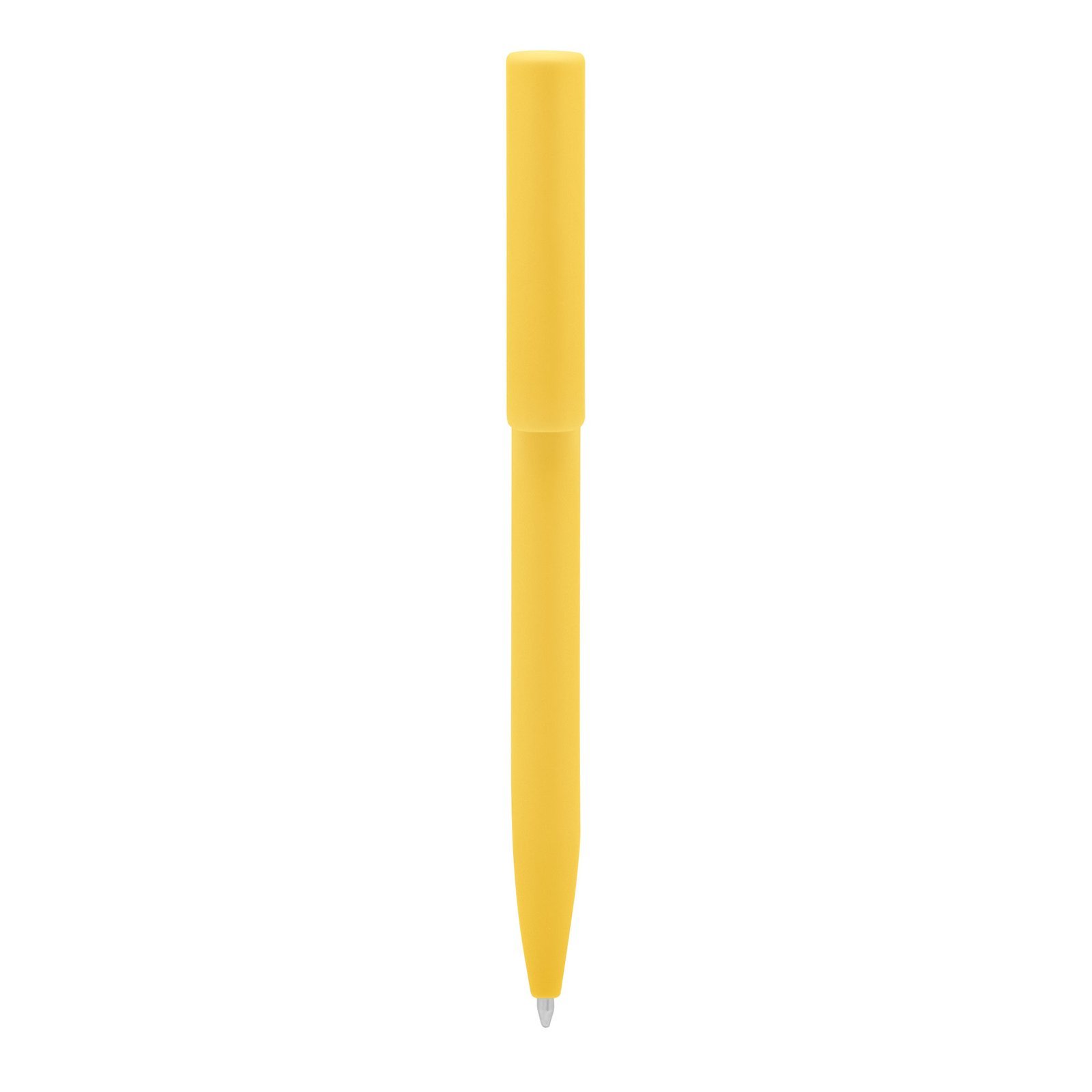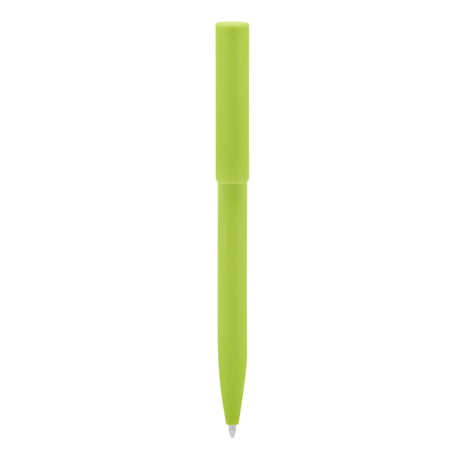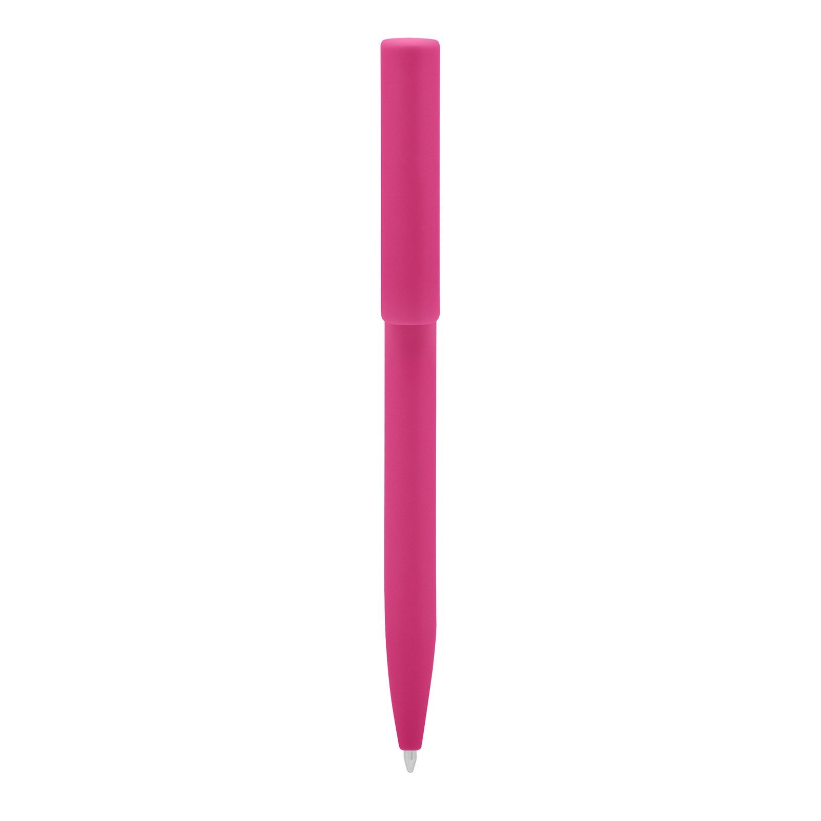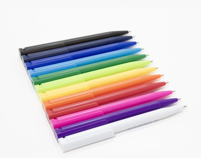 Plástico. Cuerpo de diferentes colores. Bolígrafo retráctil. Clip plástico del mismo color del cuerpo. Tinta negra. Sistema de botón push para destapar. Amplia área de impresión.