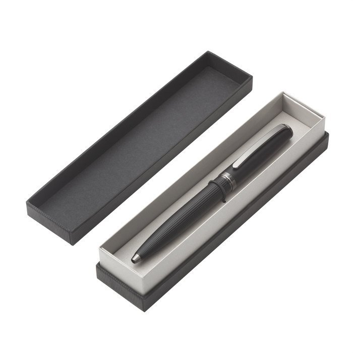 Metálico. Cuerpo color negro mate. Puntera, clip y anillo metálico. Apertura giratoria. En la parte superior destape electroplateado. Parte inferior texturada para mejor agarre. Tinta negra. Recarga metálica. Presentación en caja de regalo.