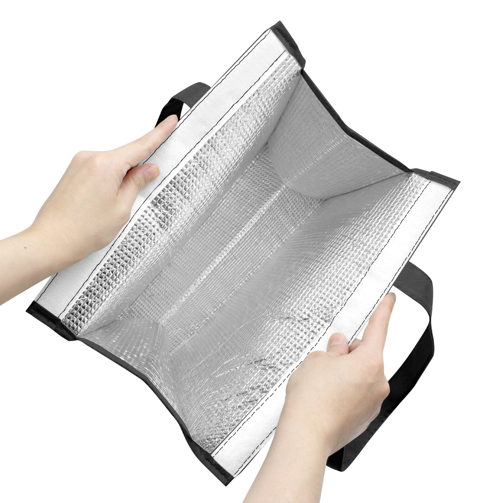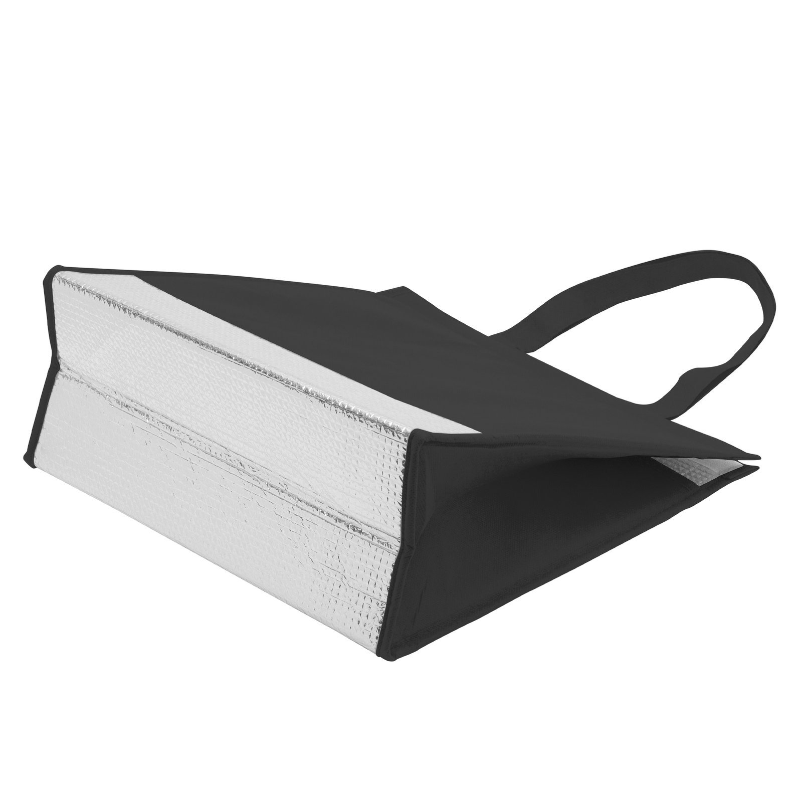 32 x 33 cm. Fuelle de 14 cm. Non-Woven de 80 g. Espuma de PE y película de aluminio. Bolsa térmica. Interior en material térmico recubierto en aluminio para mantener la temperatura. Cierre de velcro en la parte superior.