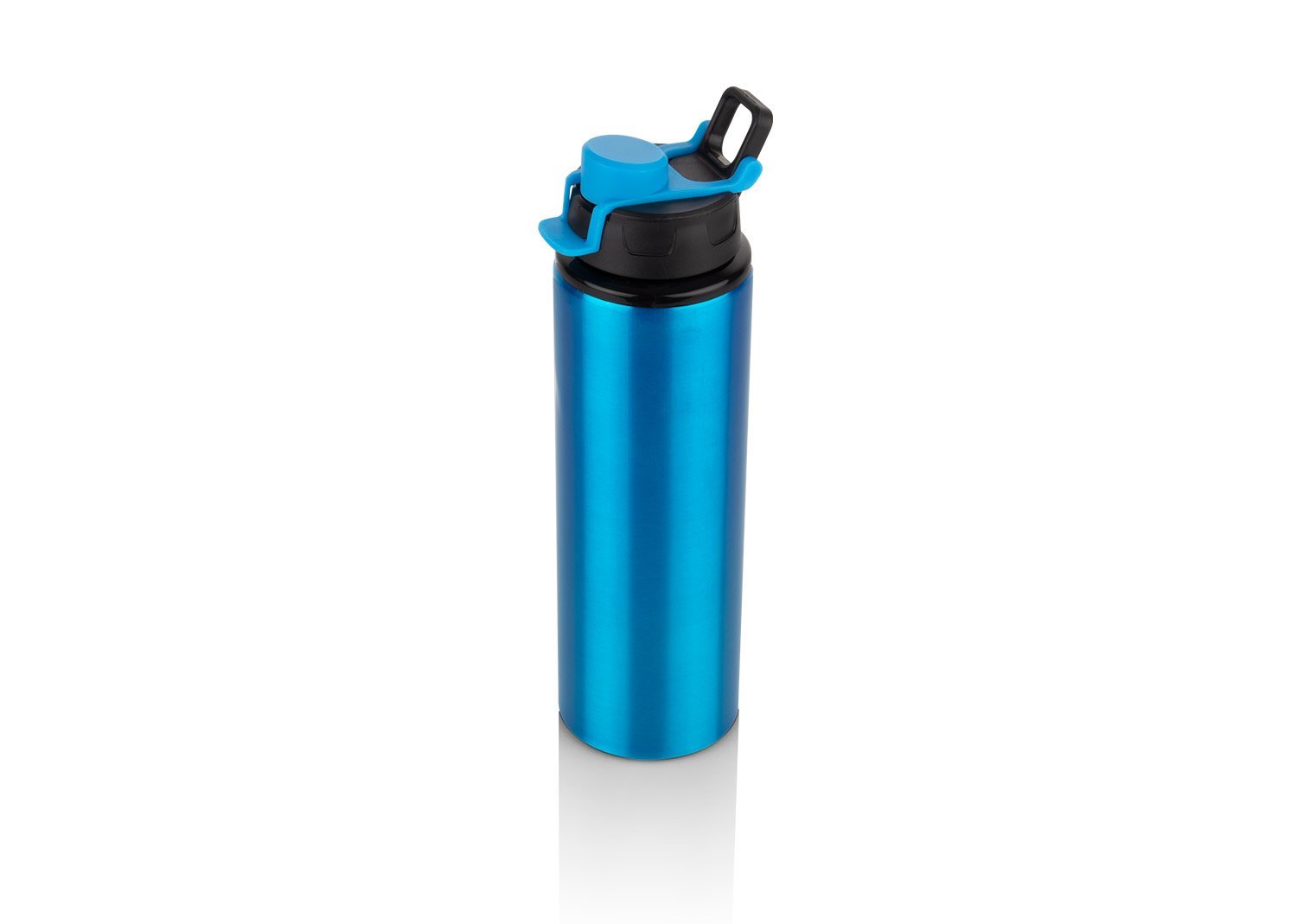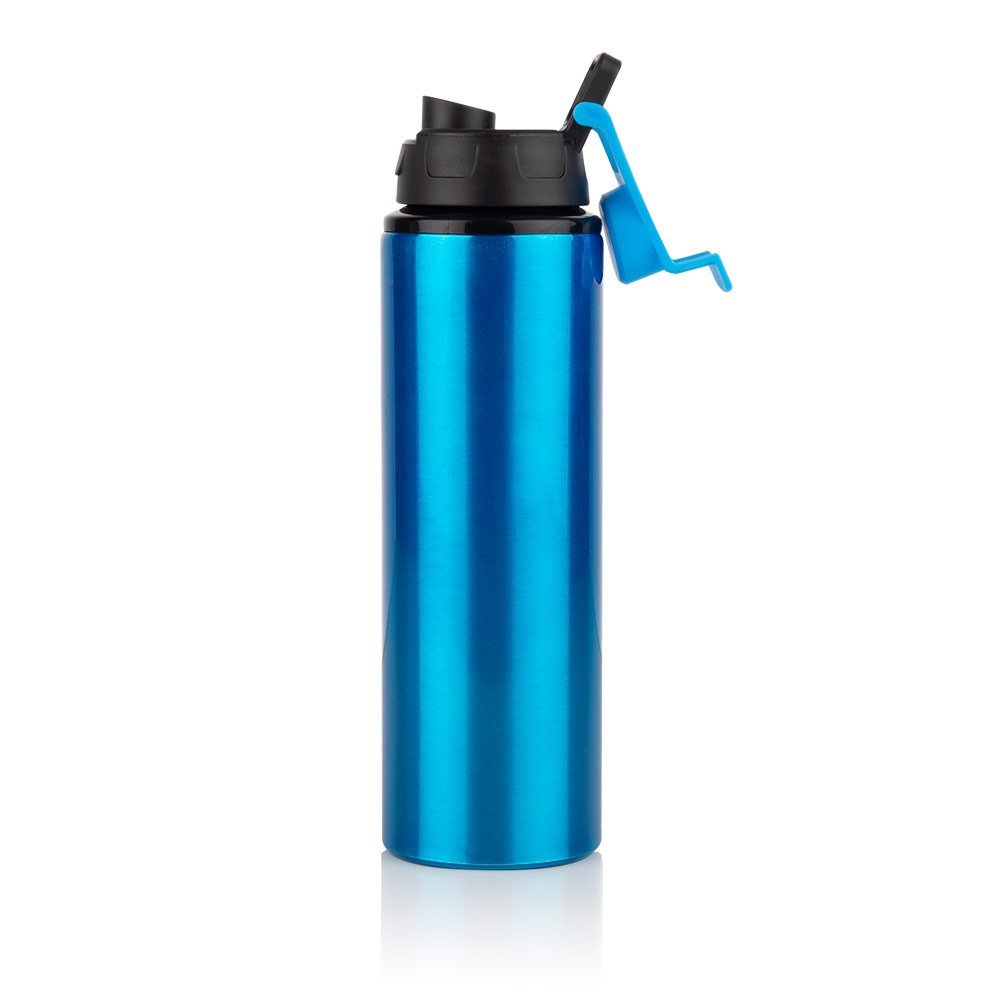 Botella en aluminio con tapa rosca plástica con boquilla y cubierta, manija plástica incorporada para transporte. Capacidad 730ml. Peso: 120g.