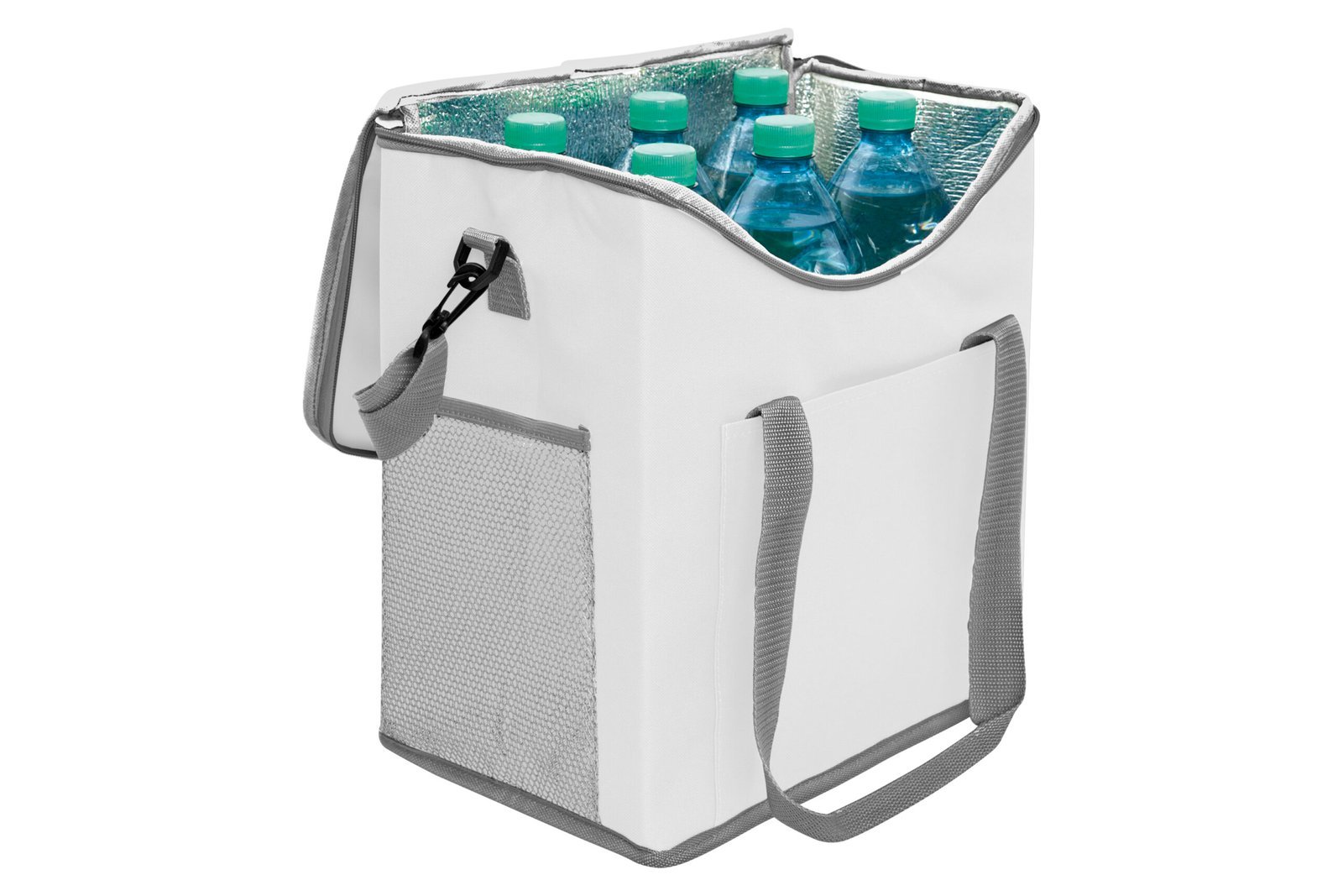 30 x 34 x 19,5 cm. Capacidad 37 litros. Poliéster. 600D Lonchera térmica con recubrimiento interior metalizado. Un bolsillo frontal y dos bolsillos laterales de red. Correa tipo bandolera y dos manijas reforzadas con cierre de velcro. Capacidad hasta 6 botellas de 2,5 litros