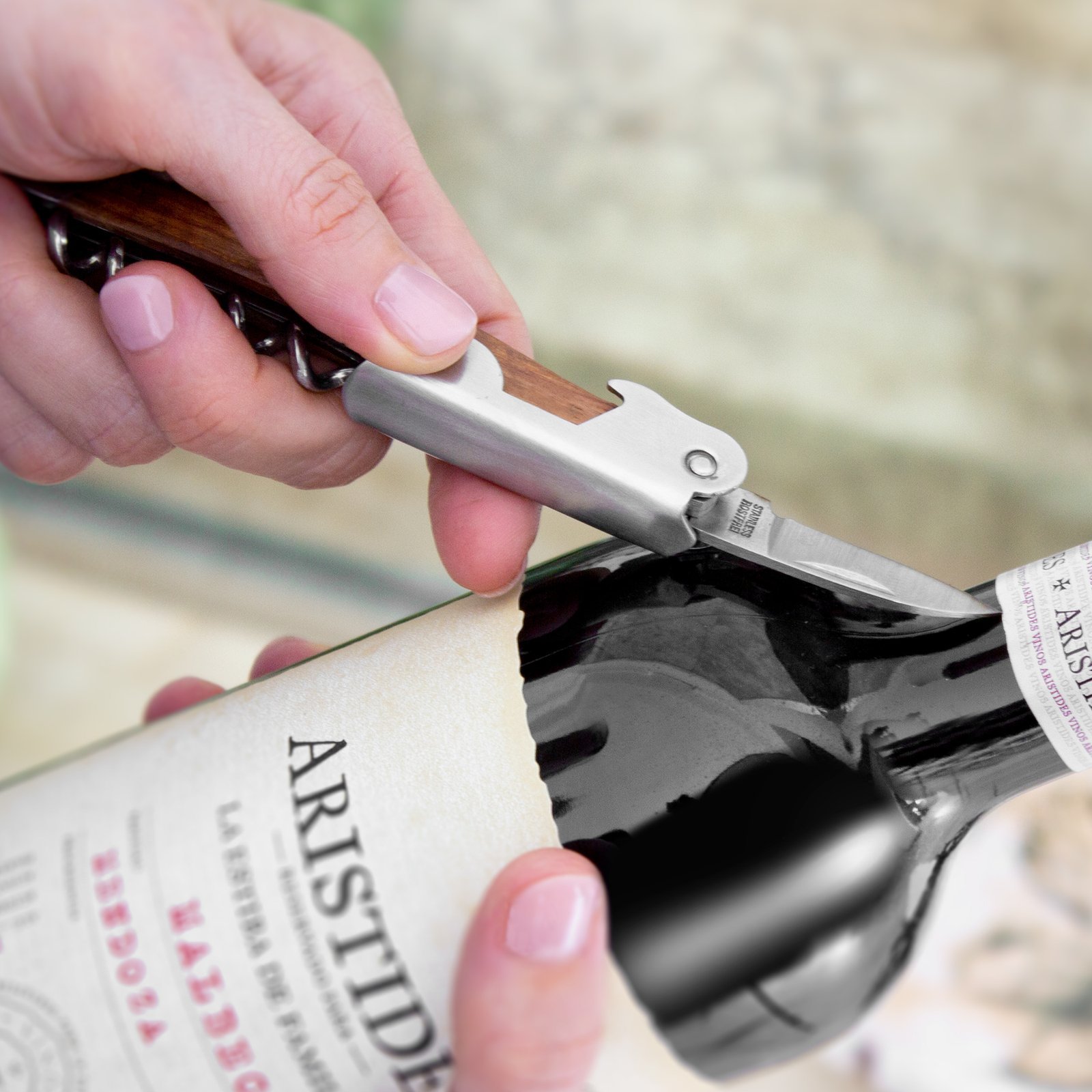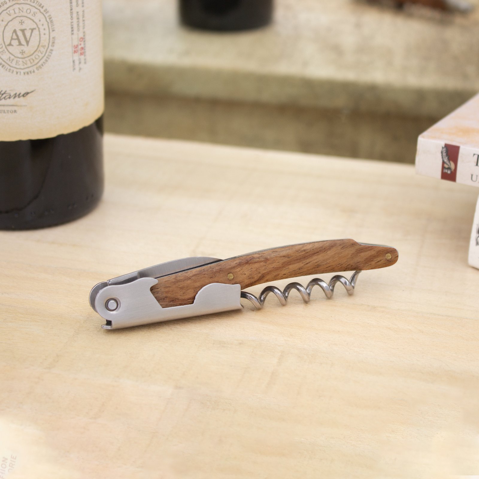 11,6 cm. Acero inoxidable. Peso: 68g. Abridor de botellas de vino en acero inoxidable con mango de madera en color natural. Accesorios incorporados: sacacorchos, navaja y destapador. Presentación en caja de regalo.