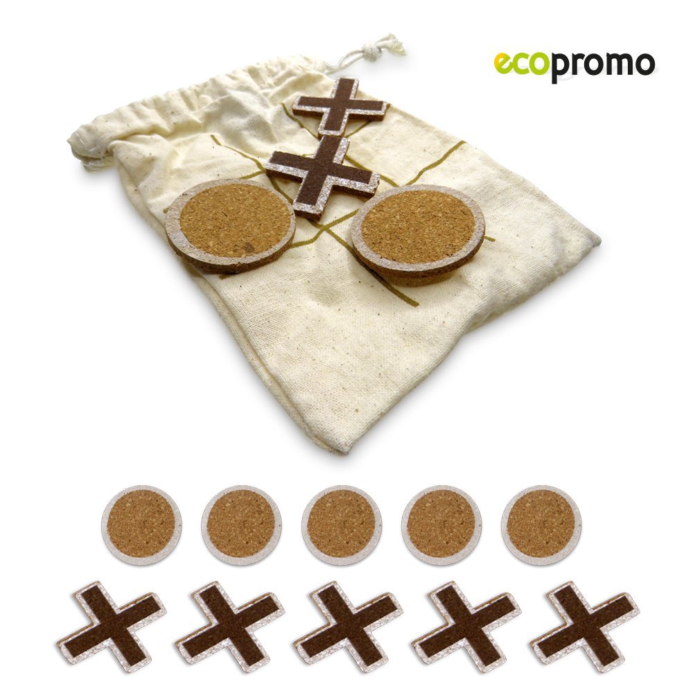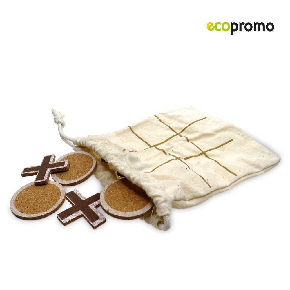 Juego triqui fabricado en corcho natural con 5 fichas circulares y 5 fichas en cruz. En bolsa de algodón con cierre de cordón que sirve como tablero para jugar.