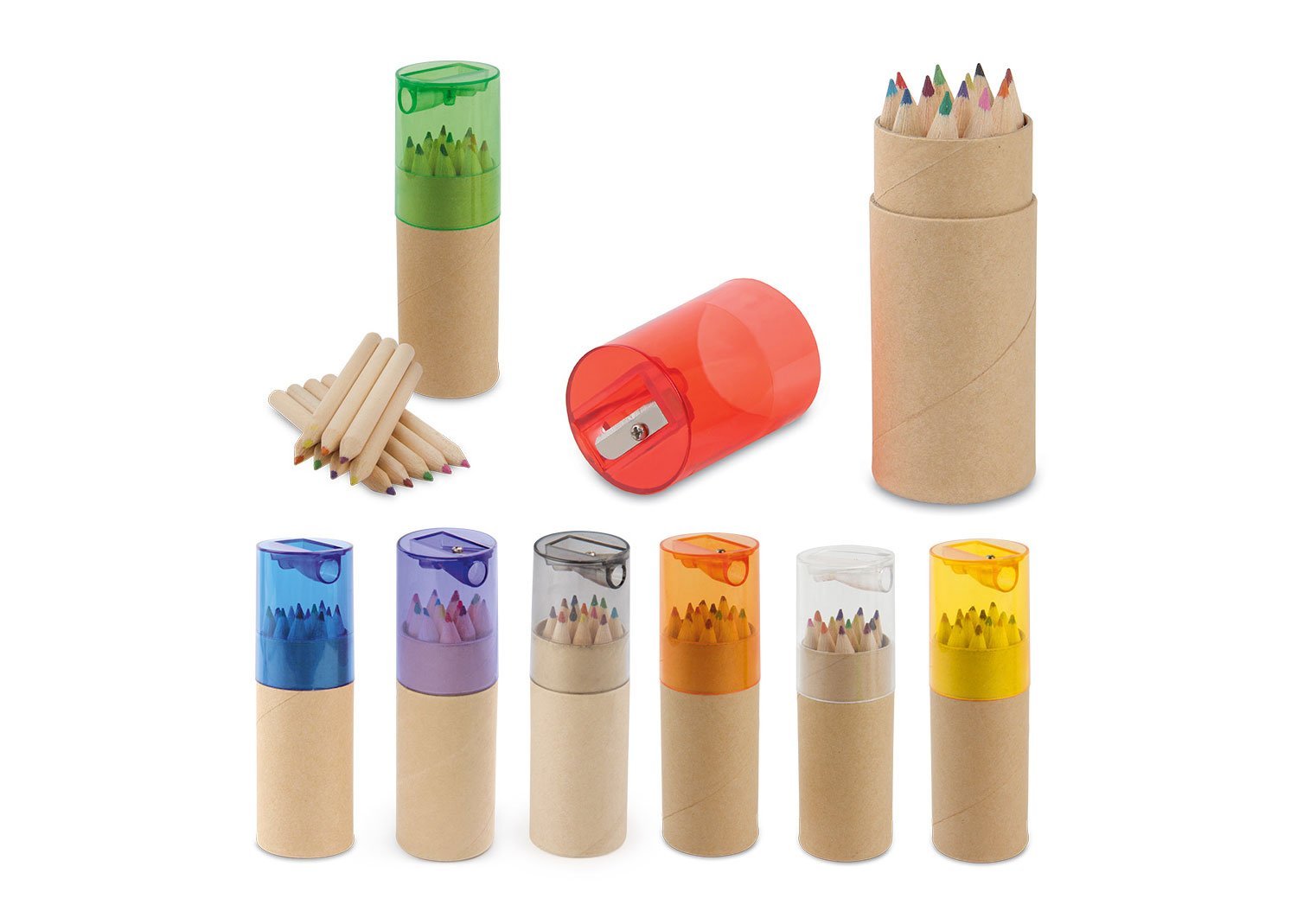 Estuche en cartón cilíndrico que contiene 12 colores de madera y tapa con tajalápiz.