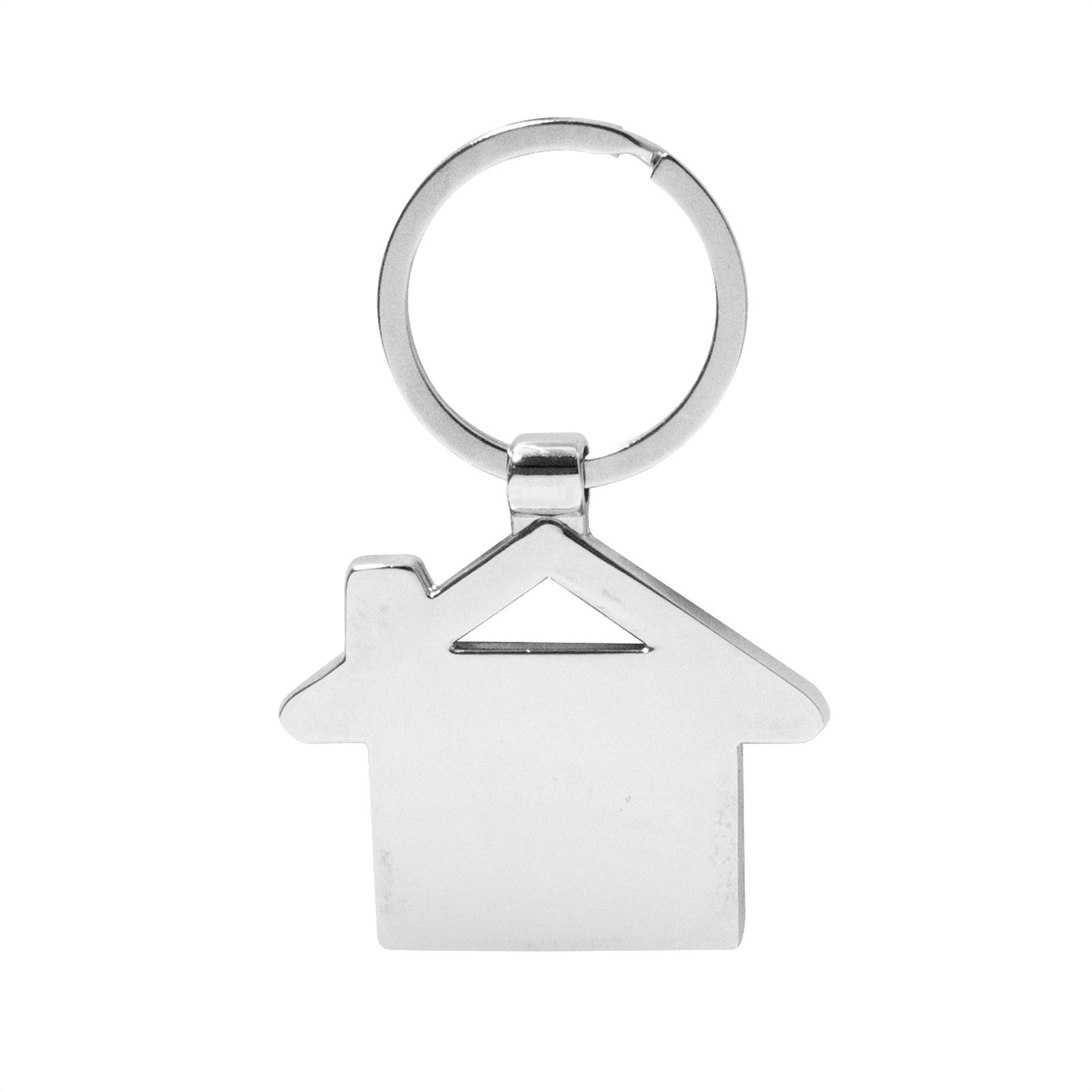 Llavero con forma de casa. Estructura metálica con aleación de zinc con acabado brillante y panel frontal de bambú barnizado.