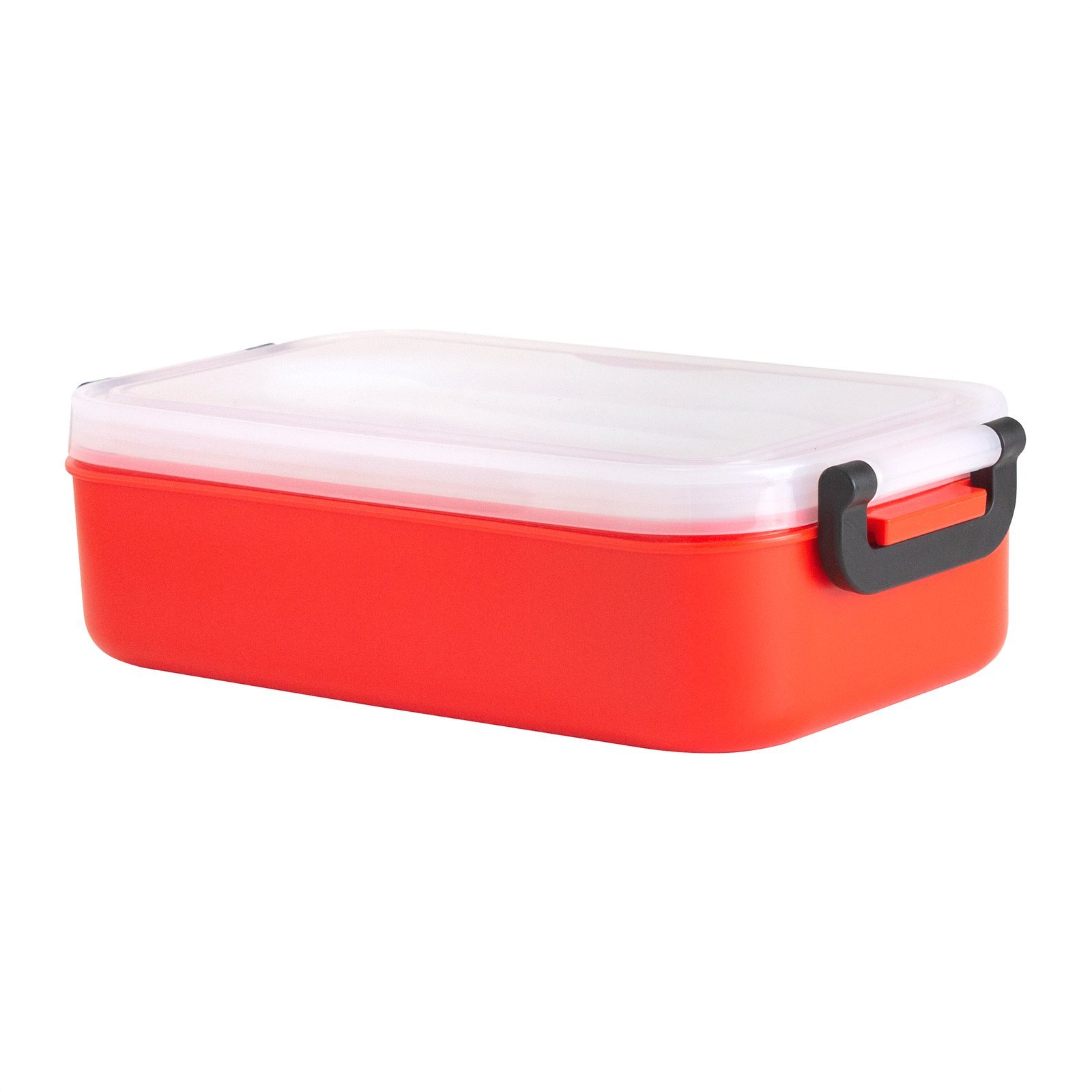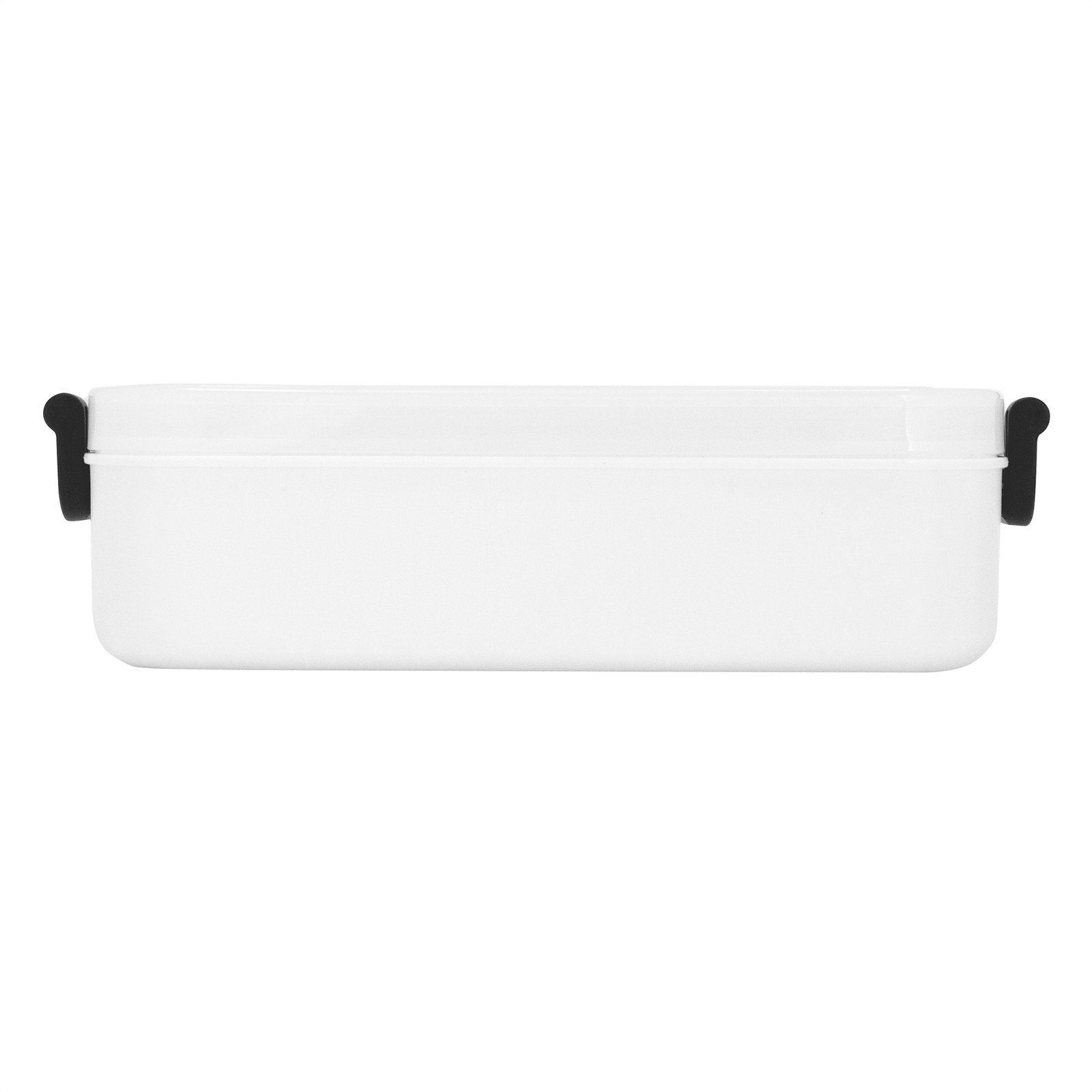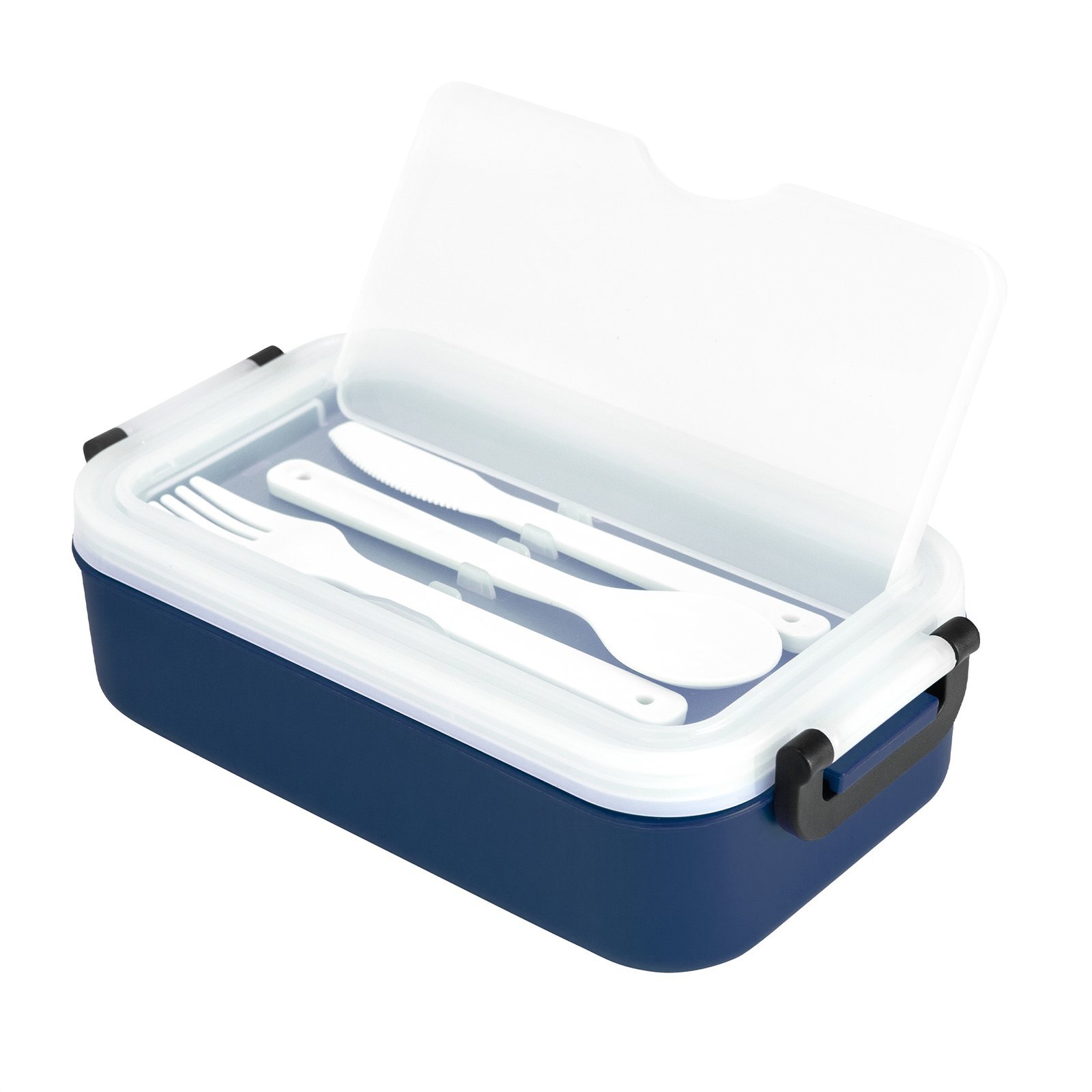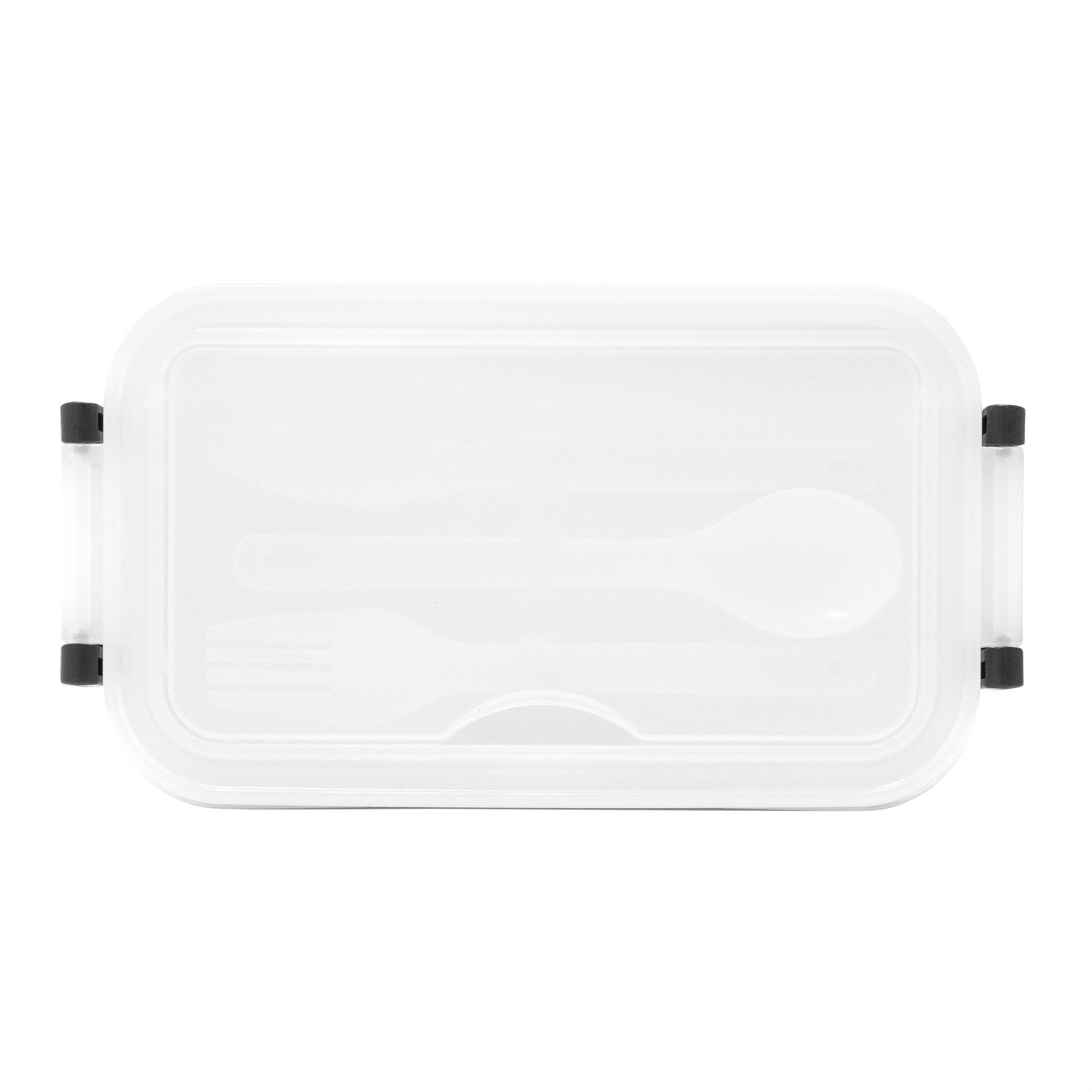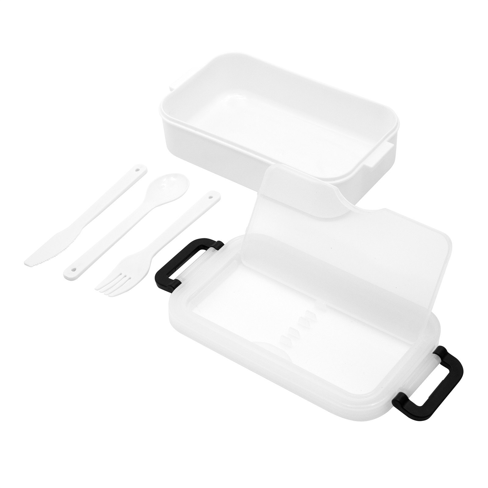 11,5 x 5,8 x 21,5 cm. Plástico PP. Contenedor de alimentos. Tapa translúcida con bandeja porta cubiertos, anillo de silicona antiderrame y ajustes de seguridad en sus laterales. Set de 3 cubiertos plásticos de color blanco (tenedor, cuchillo, cuchara) de 15 cm de largo.