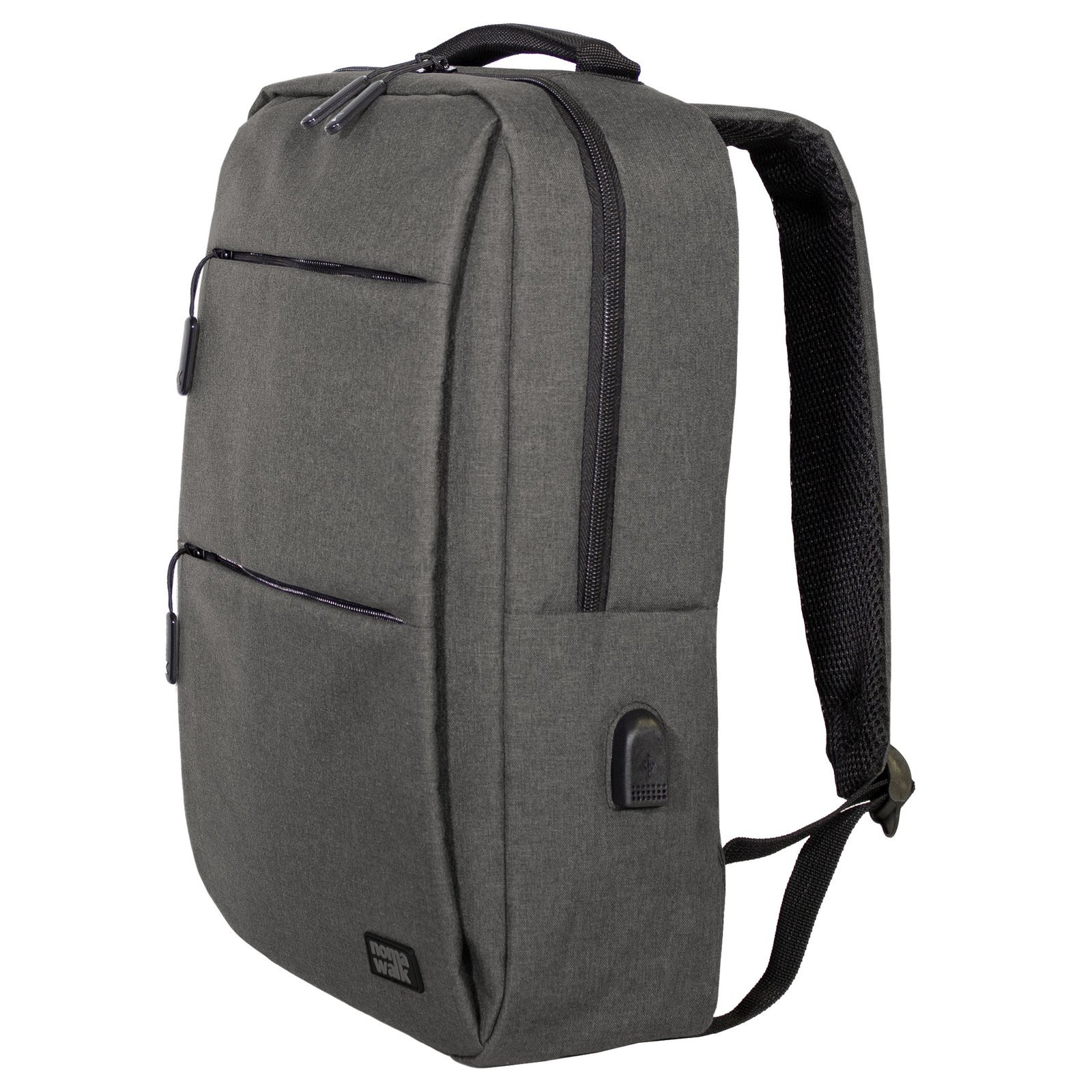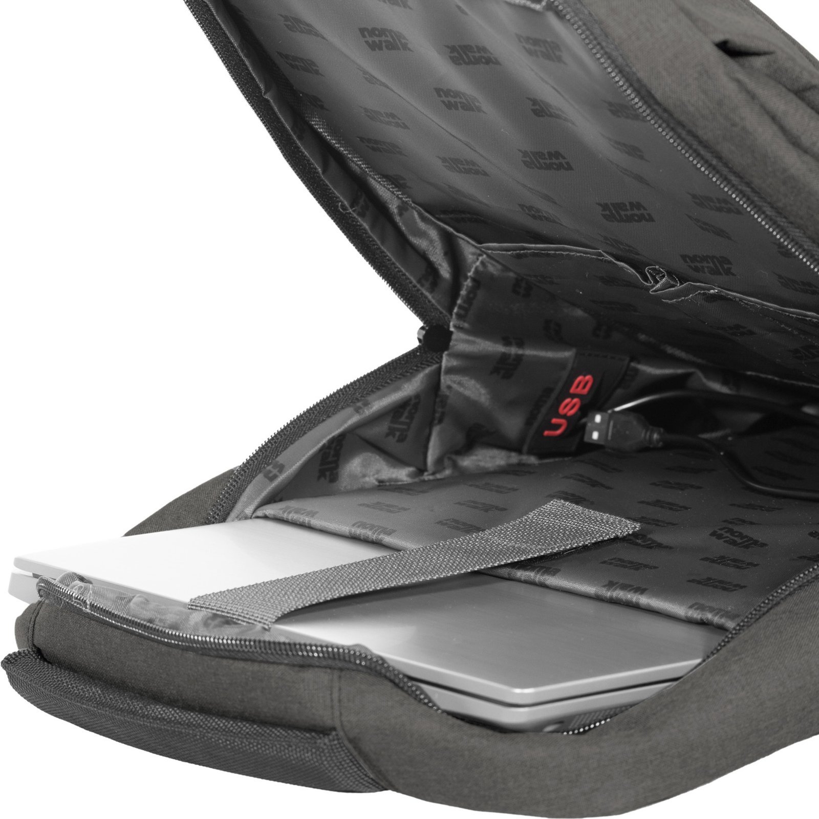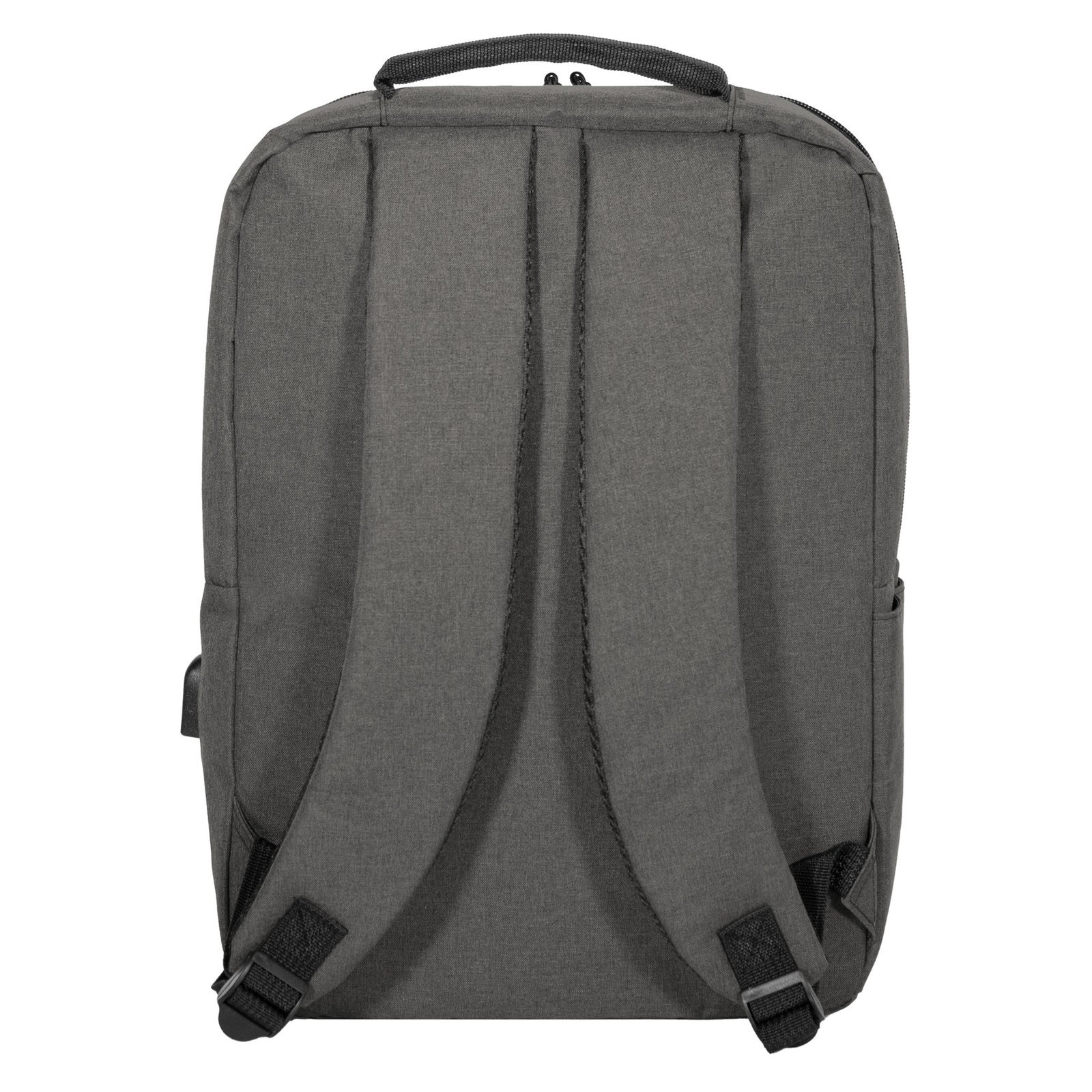 28 x 42 x 12 cm. Capacidad 14 litros. Polyester Wulong 300D Hidrofugo. Compartimento principal con cierre y bolsillo portanotebook para 16¨y bolsillos organizadores de accesorios. Dos bolsillos frontales con cierre y un bolsillo lateral. Puerto USB exterior con conector interior para bateria. Correas ajustables y espalda acolchadas. Tiradores de cierre engomados. Presencia de marca al frente y en su interior.