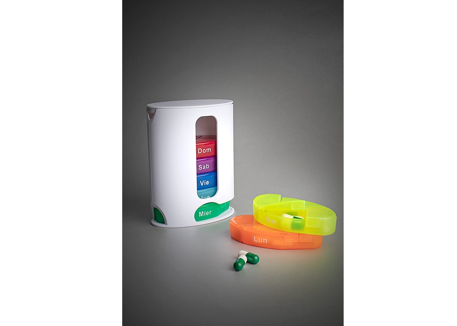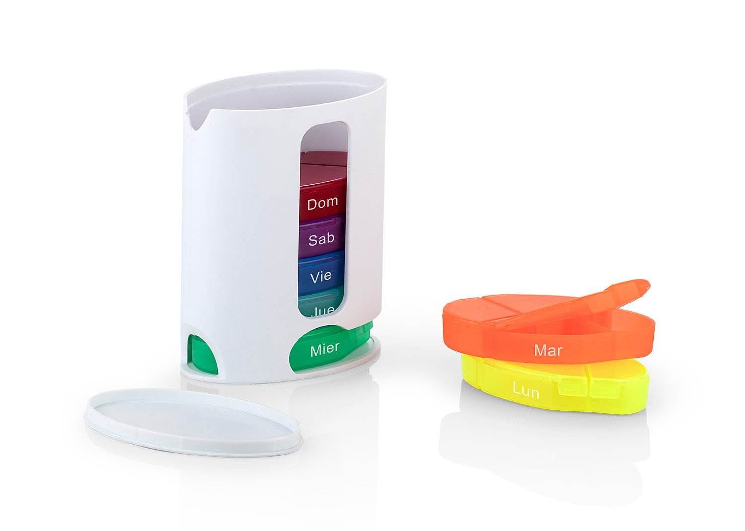 Pastillero semanal de colores con 7 compartimientos asignados para cada día de la semana. Cierre a presión.