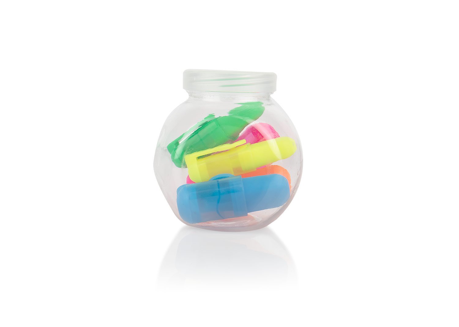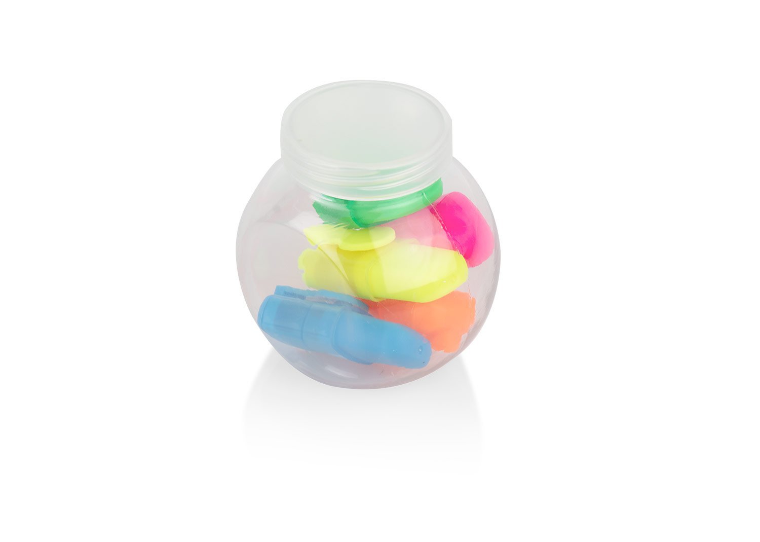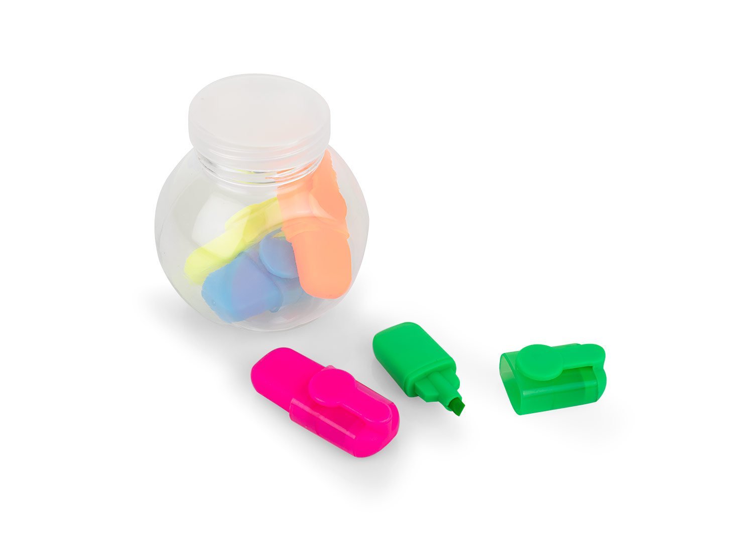Juego de 5 resaltadores en estuche traslucido plástico. Colores rosado, naranja, azul, verde y amarillo.