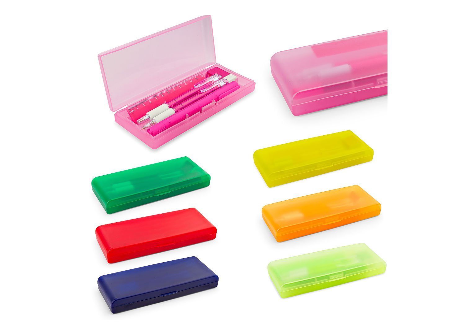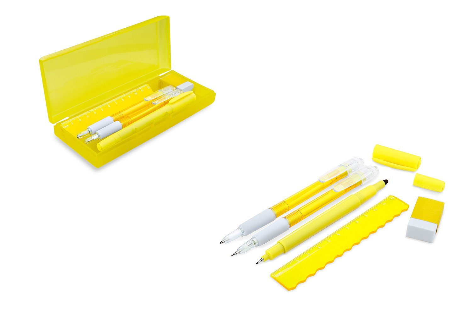 Set de escritorio en estuche plástico, contiene: resaltador, bolígrafo, portaminas, regla y borrador.