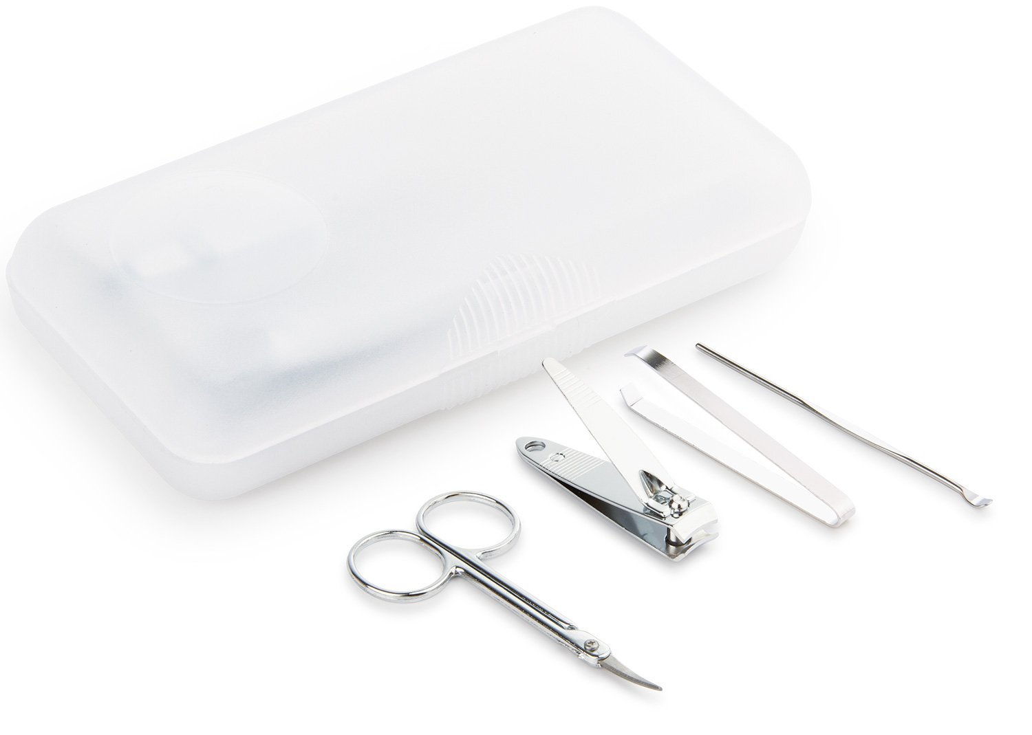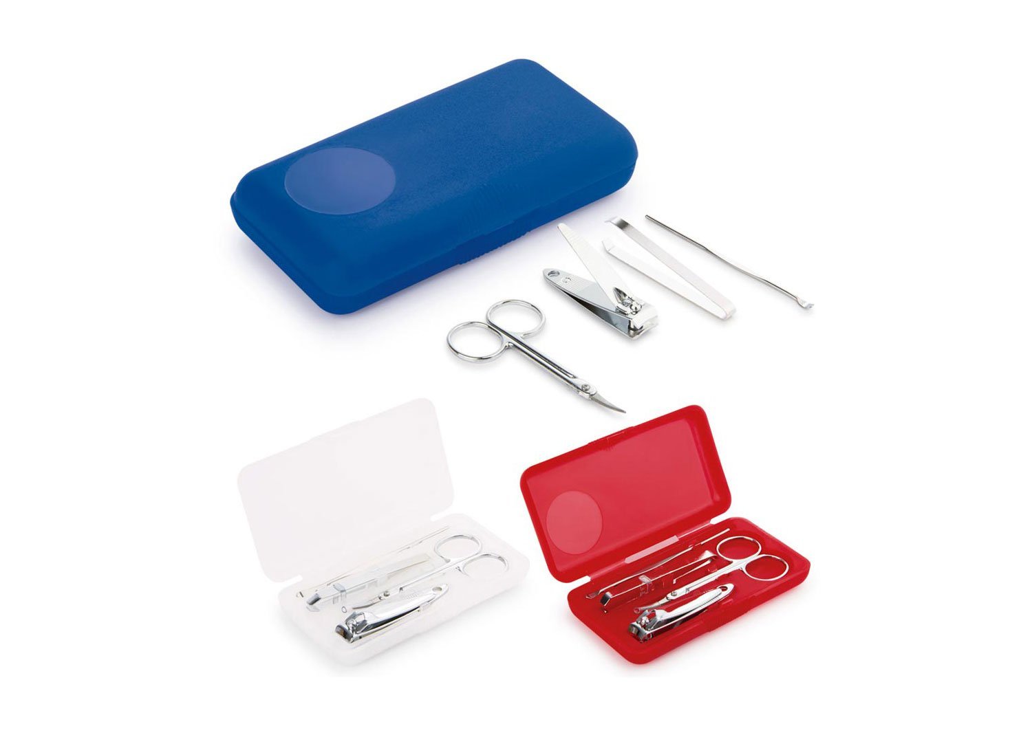 Set de manicure en estuche plástico compacto. Incluye: Cortauñas, tijeras, pinzas y bajacutículas.